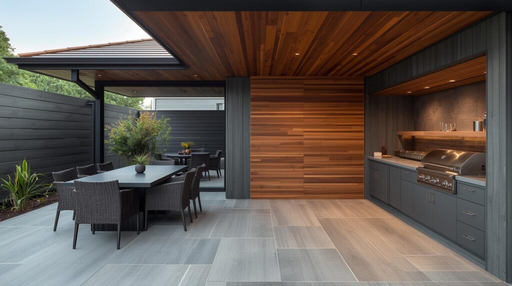 Agora outro ponto importante é a combinação entre os acabamentos e revestimentos. Uma dica que eu dou é misturar os materiais para criar um contraste, como por exemplo, usar pedra natural no piso ou no porcelanato junto com uma textura em paredes que são próximas à piscina, ou ainda combinar a cerâmica rústica no chão com o revestimento efeito cimento nos muros ou nas bancadas. Isso garante um espaço mais interessante e sofisticado, sem deixar de lado a praticidade.