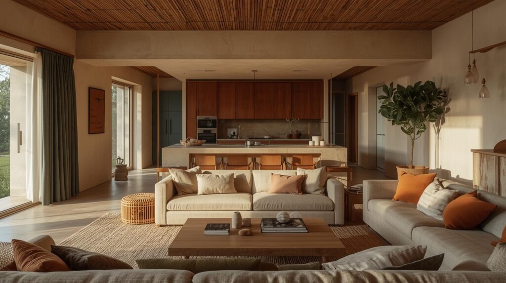 Os tons terrosos são campeões quando o assunto é aconchego. Terracota, argila, telha, ferrugem e barro criam uma atmosfera acolhedora e muito atual. Essas cores funcionam muito bem em paredes de destaque, almofadas, tapetes e objetos decorativos, e além disso, essas cores combinam facilmente com a madeira, com as fibras naturais e tecidos mais rústicos, reforçando uma sensação de casa vivida.
